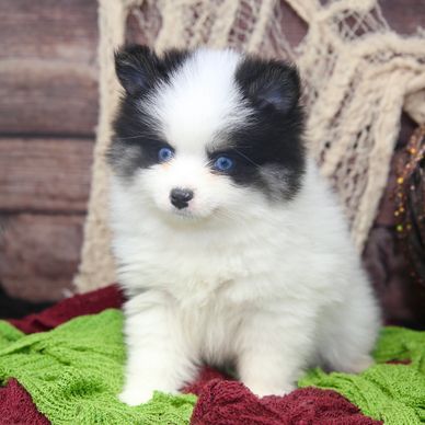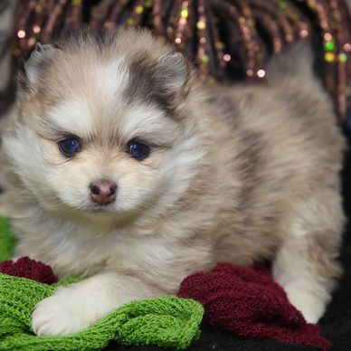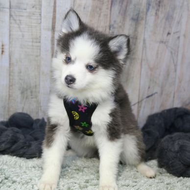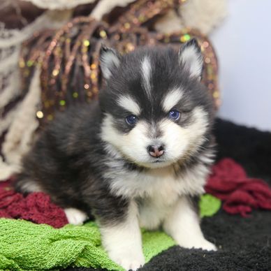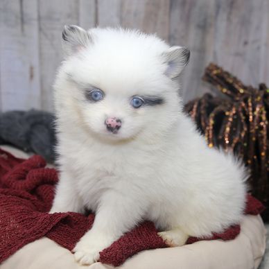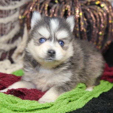 teacup Pomsky charting to be in the 4-6 pound range with 1 blue eye and 1 brown eye. She has a wooly coat, incredible teddy bear face and her husky markings will continue to come in as she gets older $6,500